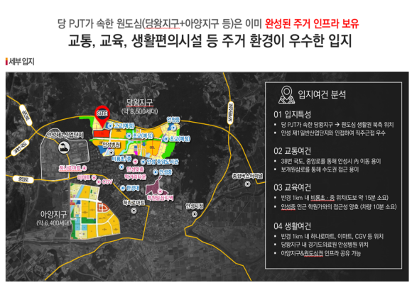 신도시급 주거 타운 안성시 내에서 개발면적 122만여㎡로 개발사업지 중 가장 규모가 큰 당왕지구에 들어선 안성시 유일의 신도시급 주거타운으로 형성됩니다.