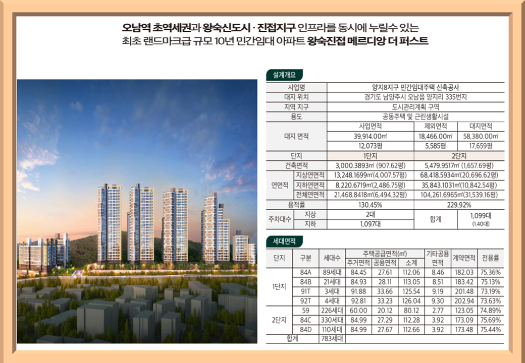 왕숙진접 메르디앙 더 퍼스트는 남양주시 오남읍 양지리 335번지 일원에 위치한 기업형 민간임대주택 단지로, 수도권 동북부의 핵심 신도시인 왕숙지구와 인접해 있으며, 교통·생활·자연환경이 조화를 이루는 프리미엄 주거 공간입니다.