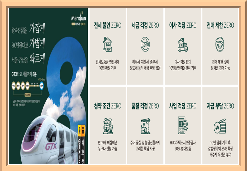 왕숙진접 메르디앙은 교통, 교육, 자연환경, 생활 인프라까지 모두 갖춘 입지에 위치해 있으며, 이사 걱정 없는 안정된 주거 환경을 제공합니다. 세금 부담 없이, 청약 조건 없이, 장기적으로 거주할 수 있는 이 단지는 내 집처럼 편안한 삶을 원하는 분들에게 최적의 선택이 될 것입니다.