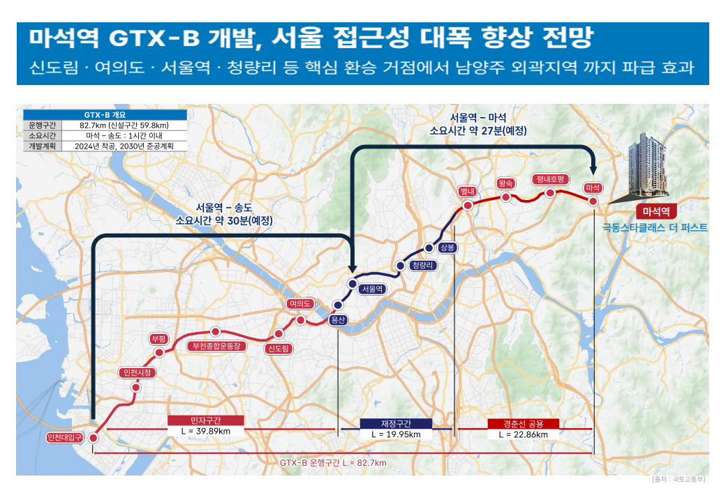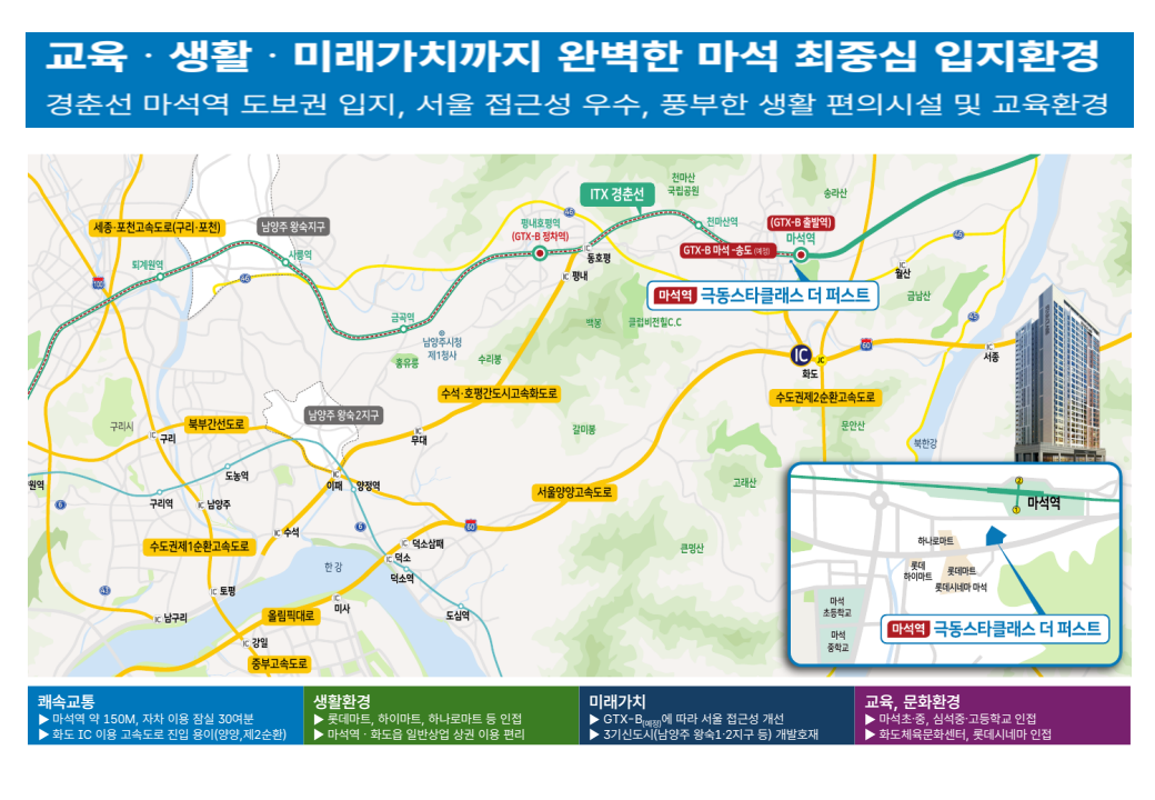 GTX-B 노선 개통을 앞둔 마석역 인근에 위치한 ‘극동스타클래스 더퍼스트’는 교통과 미래가치를 동시에 갖춘 주상복합 아파트입니다.