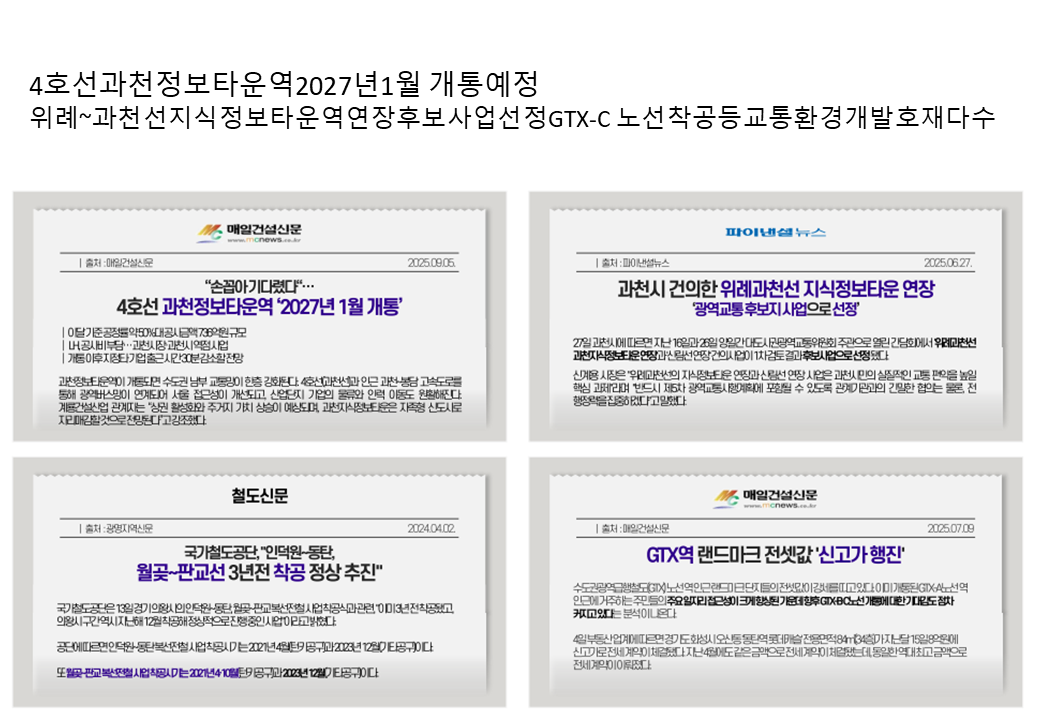 GTX-C 노선 개통과 광역 교통망 확충으로 과천의 미래 가치는 더욱 상승할 예정입니다. 교통·업무·주거가 결합된 미래형 도시의 중심 단지입니다.
