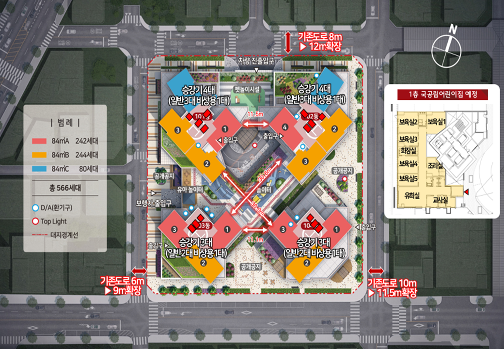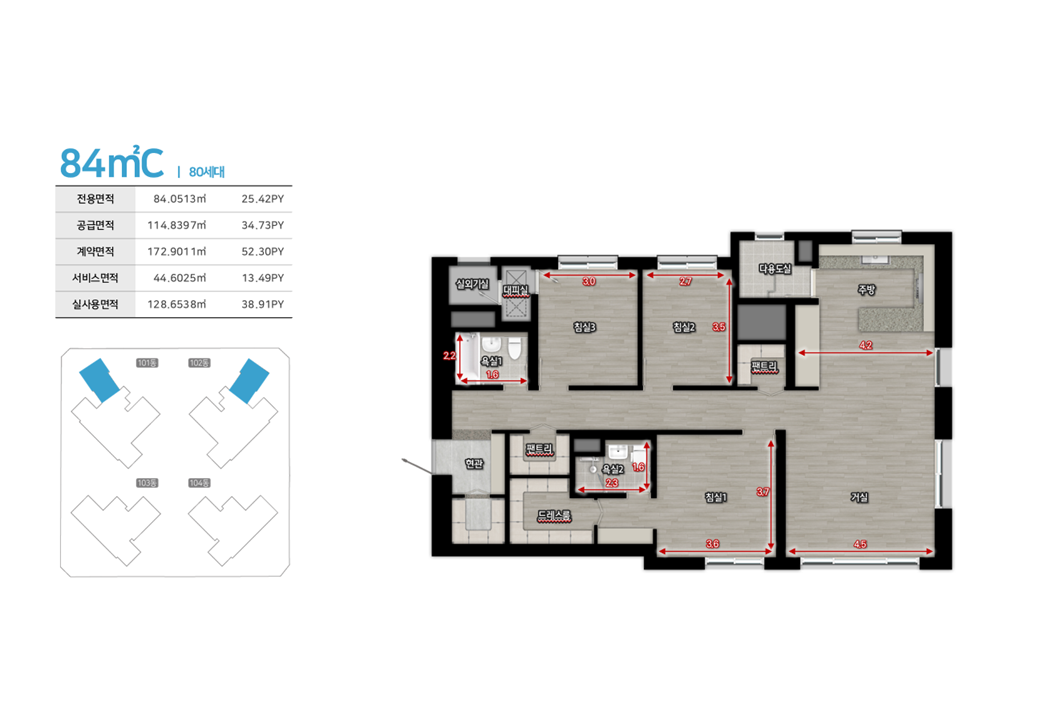 평형 구성: 전용 84㎡ 단일 평형, 타입 A/B/C