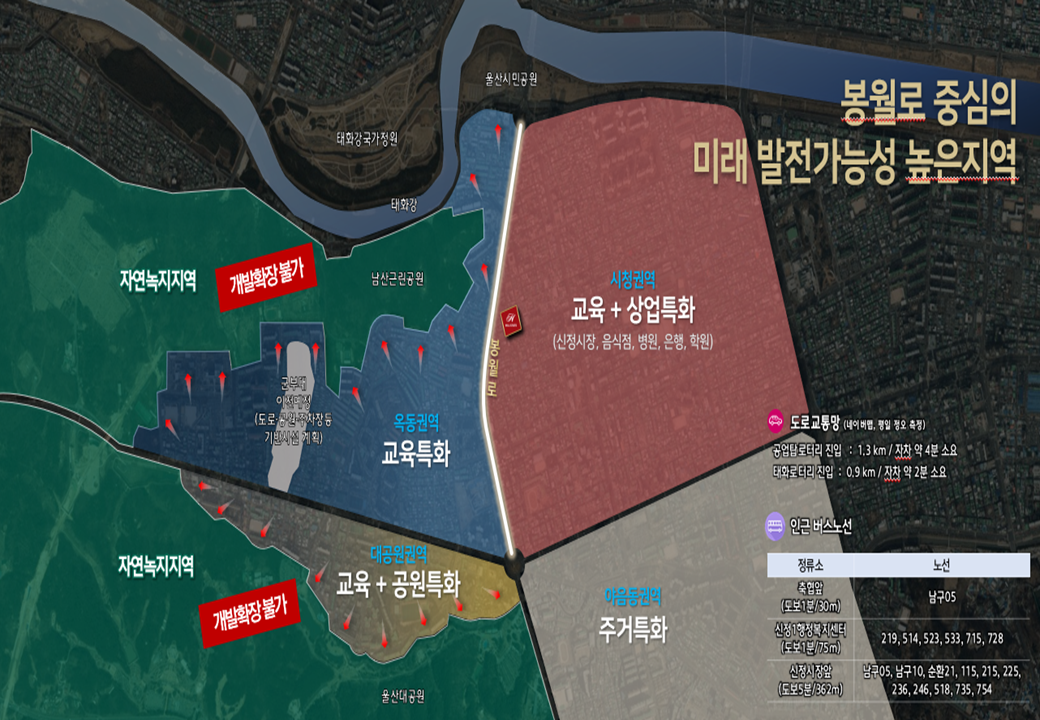 교통: 문수로 접속, 봉월로 등 주요 간선도로 연결. 향후 울산 도시철도 1호선(트램) 개통 예정