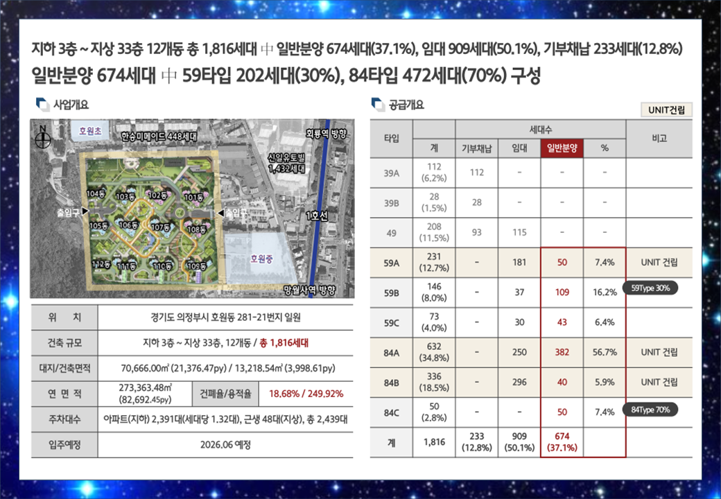 힐스테이트 회룡역 파크뷰는 의정부 호원동에 의정부시 호원동 281-21번지 일원에 들어서는 대단지 아파트로, 역세권·숲세권을 동시에 누릴 수 있는 매력적인 주거 공간입니다. 총 1,816세대 규모로, 전용 59㎡와 84㎡ 중심의 국민 평형으로 구성되어 있어 실속 있는 생활을 원하는 분들에게 딱 맞습니다.