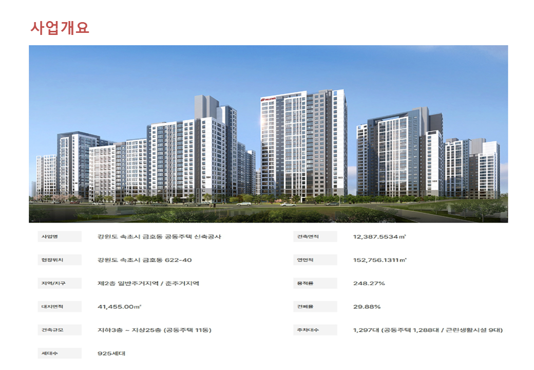 대단지 총 925세대 규모의 대단지 아파트로, 속초 지역 내 랜드마크로 자리매김할 가능성이 큽니다.