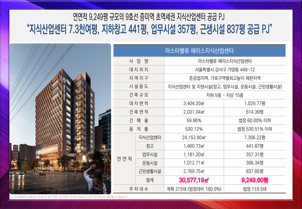 서울 강서구 가양동 449-12번지, 9호선 증미역 도보 1분 거리에 위치한 증미역 초역세권 마스터밸류를 소개드립니다. 증미역 초역세권 입지를 활용한 지식산업센터 + 지원시설 복합 개발로, 교통·업무·생활 인프라를 모두 갖춘 것이 핵심입지입니다.